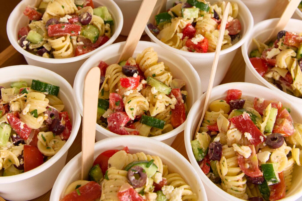 Take your guests to the sun-kissed coastlines of Greece with this zesty pasta salad. Each portion bursts with fresh, vibrant flavors that mingle perfectly in individual cups. Crunchy cucumber, sweet tomatoes, briny olives, and creamy feta come together with our secret touches – marinated capsicum and silky artichokes. Finished with a classic lemon, olive oil & herb dressing, this dish is bright and irresistibly satisfying.